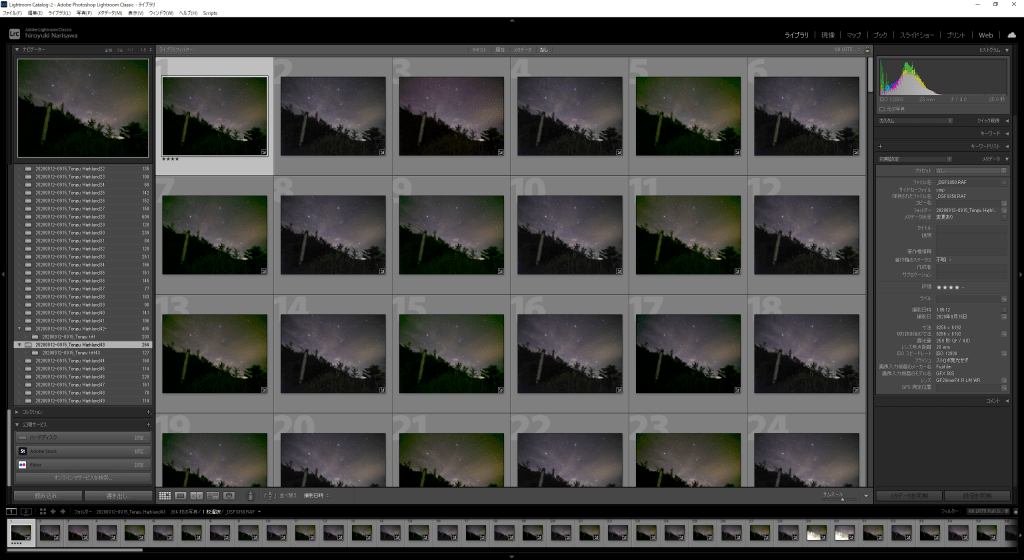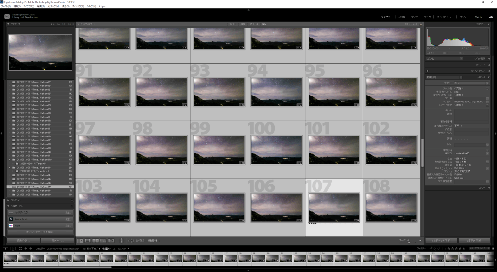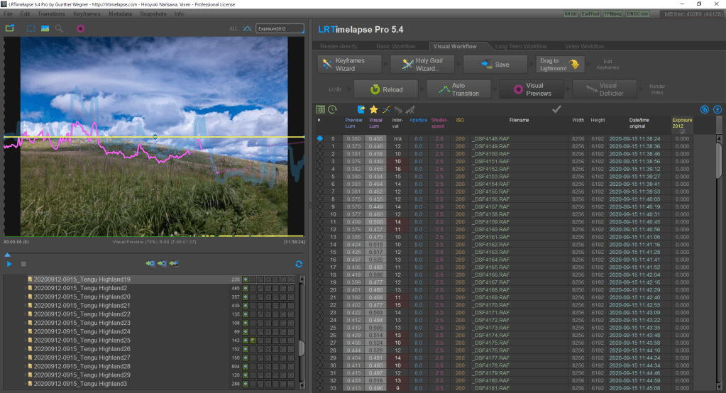 これがLRTimelapseの画面です。左下の欄がそれぞれのシーケンスごとにフォルダになっています。数字は格納されている枚数ですね。