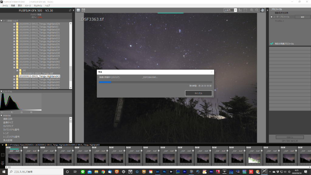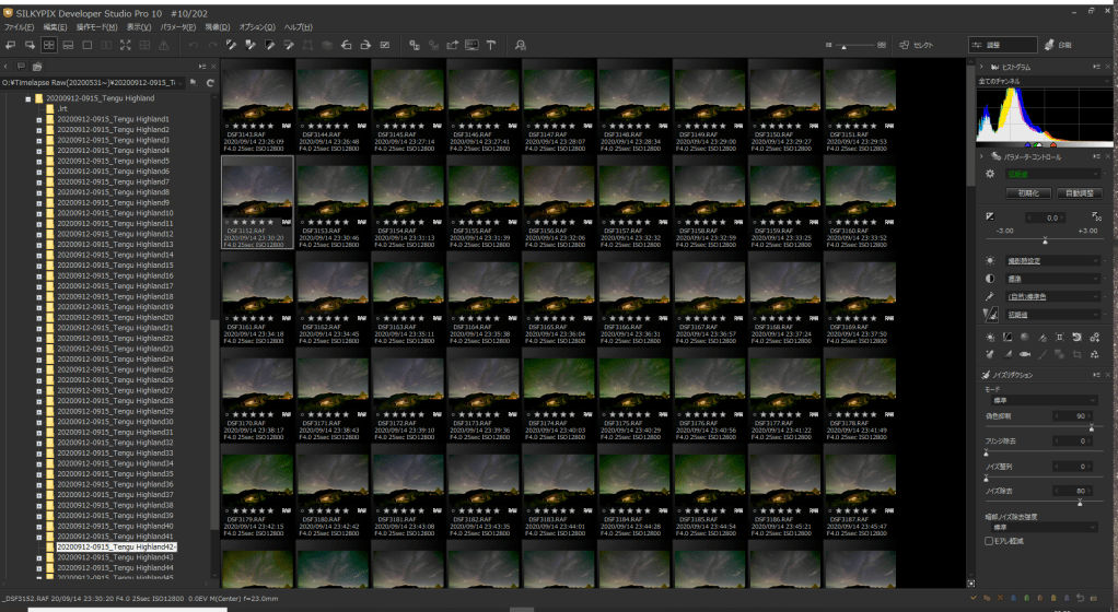 幸いにも星空のシーンなので、露出が大きく変わることはありませえん。とりあえず適当に色だけ整えられればなんとかなるし。RAWがだめならtiffで一度書き出し、それに画像処理を加えることで何とか使い物になるはず。