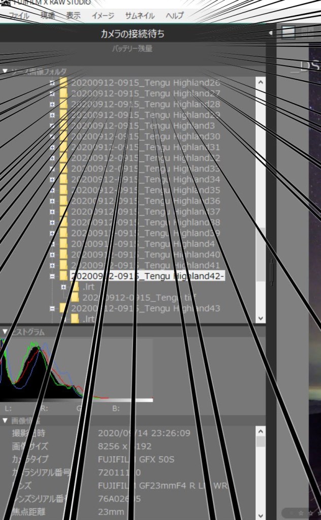 GFXをつないでみました。このソフト、撮ったカメラじゃないとだめなんですね。X-T3接続しても動きませんでした。