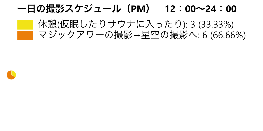 今回3日間撮影してきたわけですが、一日のタイムスケジュールを円グラフメーカーなるものでグラフにしてみました。