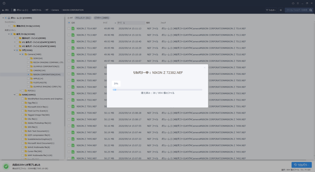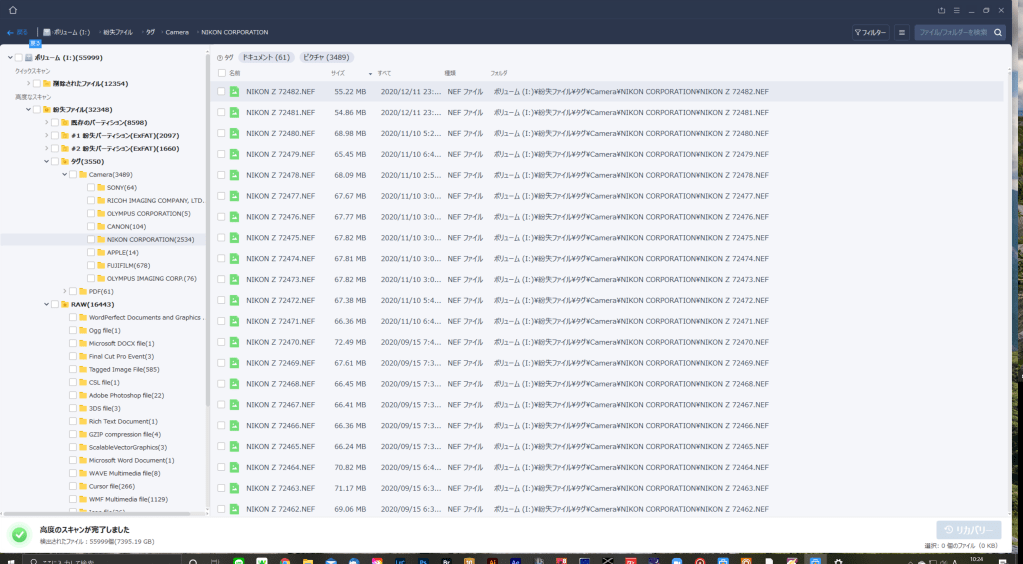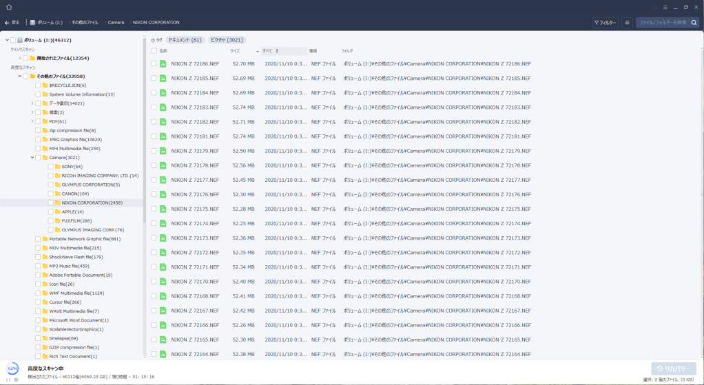 というのも、いろんなカテゴリーで復旧できるみたいです。カメラメーカー縛りとか、RAWデータ縛りとか。今回はNIKON縛りでのフォルダがありましたので、復旧したいデータにチェックして、保存先を指定し、右下の「リカバリー」ボタンを押します。