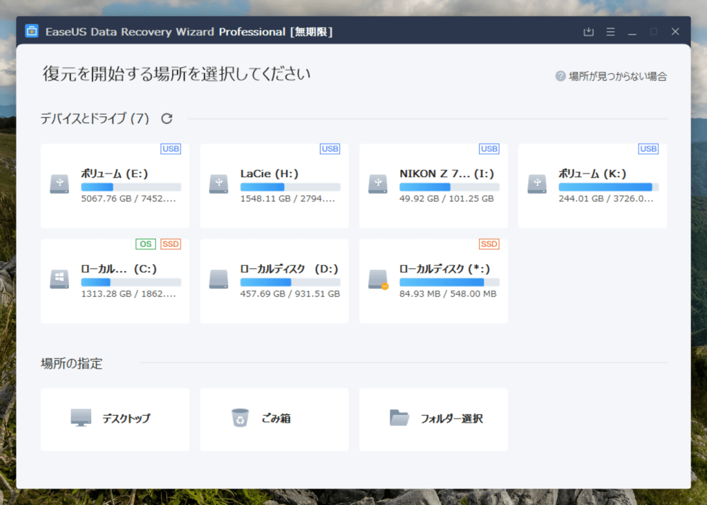 インストール後、ソフトを立ち上げるとこのような画面になります。この中からデータ復旧したい記憶媒体を選ぶわけですね。