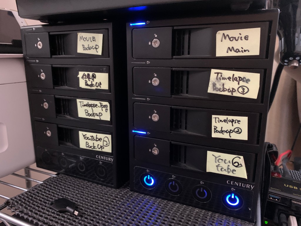 我が家のHDD、それぞれのデータ保存と、バックアップ。基本8TBのものを使っています。